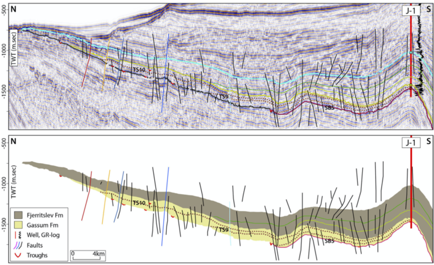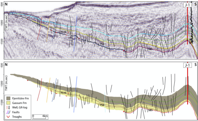 Seismic profile crossing the Lisa structure in the right side of the figure. One well (J-1) has been drilled into the Lisa structure. Figure from Olivarius et al., 2019.