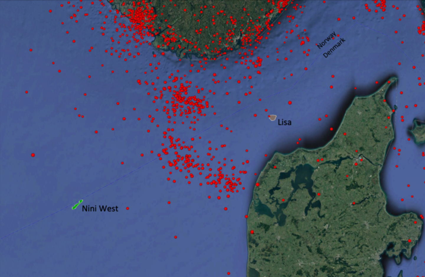 The location of the Nini West field and the Lisa structure in the Danish North Sea. The red dots show locations of earthquakes.
